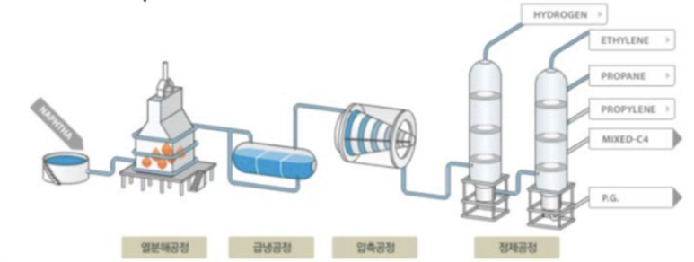 납사분해 공정은 크게 1. 분해공정 2. 급냉공정 3. 압축공정 4. 정제공정으로 되어 있어요.