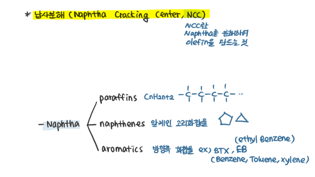 납사분해(NCC)란, Naphtha Cracking Center이에요. 말그대로 납사를 분해하는 공정입니당